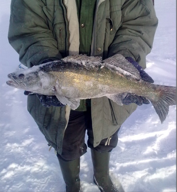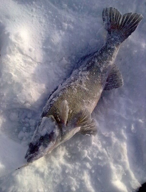 Из приятного, утром вытащил багориком Серёге судака на 3.700кг, польстился колебалкой с цепочкой... Дело было так, мы на лыжах с утра сразу пришли на лунки, где хапали 3 недели назад, забурились, ничего... У меня звонит труба, Серёга, поинтересовавшись длиной моего багорика, позвал на помощь, сказал что зацепил какую-то хрень и не может вытащить. До него метров 300, собираюсь и на лыжах иду против ветра на помощь. Прощупав нечто, кричу Серёге что у него там рыбина и вытаскиваю судачину на улицу, хорош клыкастый.