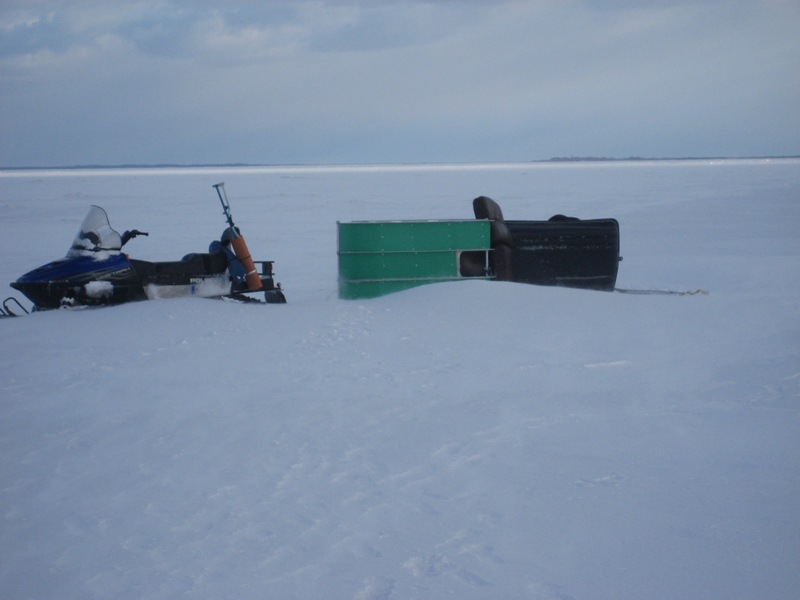 Как обычно, 2ое самых активных вышли перед деревней и попехали, а остальная 4ка ленивых вальяжно поехала в озеро на санках на 8км. Отошли в сторонку от основного автомобильно-рыболовного столпотворения и терпеливо начали искать свою рыбку, испытывая те же проблемы, что и все рыбаки вокруг - сначала поставить палатку, а потом придерживать ее своей могучей спиной ... все равно в палатке лучше, чем без нее