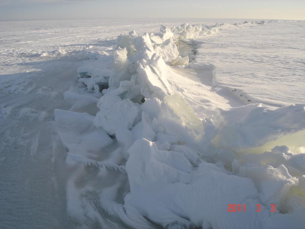 Живых трещин мы на Озере не видели (во всяком случае там где мы продвигались). Едут на всех видах транспорта - каракаты, джипы, снегоходы, и пытаются ехать на неполноприводных машинах. На 12 км видели только один Land cruiser.