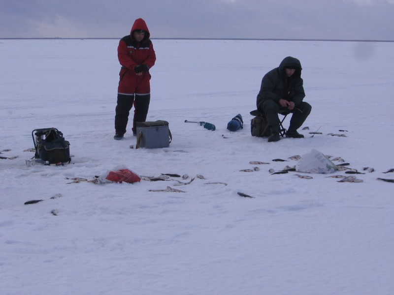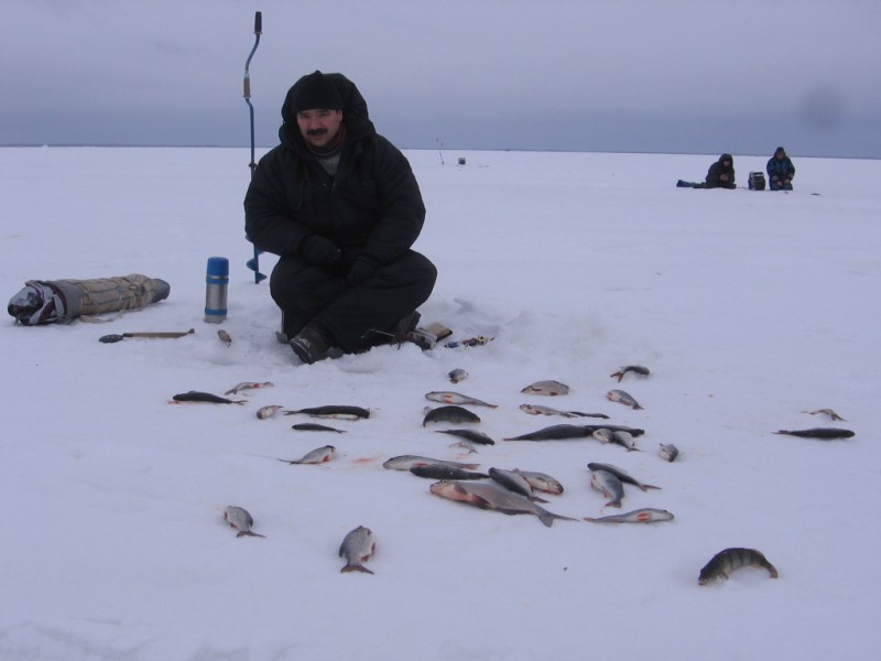 Суббота, Колькья. Буранщик доставил на 8 км, отошли чуть в сторону, просверлился и не сходил с места - красивая плова до 11-ти брала без перерыва, несмотря на толстую леску и крупный окуневый банан. Клев от метра выше дна. Ниже тоже проскакивала рыбка, но и ерш присутствовал. Потом с небольшими перерывами клев продолжался, днем стал преобладать окунь. Подержал окуневого монстрика, протащил до кромки льда, но под лункой он начал шарахаться от света и умудрился отцепиться. В этот раз его взяла. Концессионеры тоже неплохо ловили. В 15.00 клев у всей команды полностью прекратился. Только редкие ершики теребили со дна. Побегал, поискал немного, безуспешно, к 17.00 закончили. Уловы от 15 до 21 кг (21 у меня). Узнали у буранщика, что соседи, бывшие в 300 метрах от нас поймали по 1-2 кг. Обратно добрались без преключений. Спасибо Озеро за такой подарок.