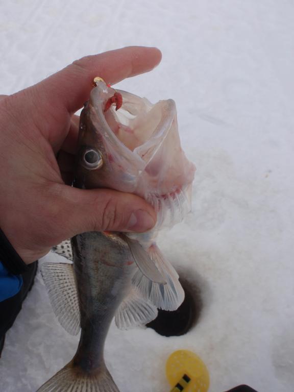 Сегодня в 13 часов был на своём излюбленном месте. Опустил мормышку на дно,и сразу уверенная поклёвка!!! Сопротивление рыбы было какое то странное,не обычное. Склонялся больше на сторону окуня,но когда увидел в лунке клюв,был весьма удивлён!!!