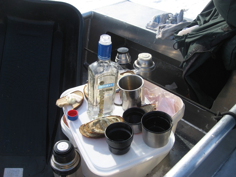 Были погранцы, проверлили документы, сверились насчет машины. Сказали, что на лед пускать будут еще недели 2-3 как минимум, вопрос, какой лед будет в это время...В общем, рыбка присутсвовала, брала, порой даже активно. Поймав маленькую рыбу, ей, как положено наливали и отпускали в лунку – и тут же следовала поклевка солидного окуня!