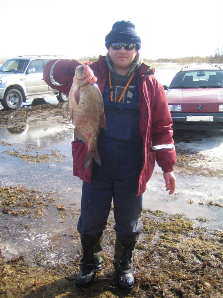 Туман рассеялся и потихоньку начали искать то за что Чудо благодорят. В один момент Олег (ОЦ) начал вываживать хорошую рыбку, которую с помощью багорика достаточно быстро извлекли на свет. Затем в это же у рядом сидящего НП Бати завязалась борьба. Подвели к лунке багрю, и ломается крюк, но лещик не сходит. Пытаюсь достать рукой, но они оказываются коротковаты: достаю только до губ. В это время подвозят второй багорик, цепляем с горем пополам, расверливаем лунку и вот он красавиц, лещ трепыхается на льду. Долго любуемся на эту красоту, НП делает фотки и расходимся. Уже под самый отъезд немного смещаюсь к залому, бурюсь и сразу ловлю первого за день ерша. Вот так сместился, и зачем спрашивается, но остаюсь. Затем подряд несколько плотвиц и после очередной поклевки чувствую тяжесть. Рыб сопротивлялся сильно, несколько раз пришлось сдавть леску, но к лунке подвожу. Пытаюсь снова достать рукой но в 130 размер не лезет совсем. Оборачиваюсь, а ко мне уже подбигает Барсик с правильным буром, быстро разбуриваем лунку и достаем красавца. Собираюсь и иду к санкам со спокойной душой, так чертовски приятно осозновать, что предчуствие меня не обмануло. Подошел к санкам, меня зовет Борька, грит тащу, но справляется сам и достает закилошного лещика, и... затем сразу же второго, вот гад