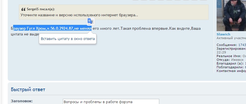 Браузер Гугл Хром,v.56.0.2924.87,не менял его много лет.Такая проблема впервые.Как видите,Ваша цитата не выделена.SergeiS писал(а):Уточните название и версию используемого интернет браузера..