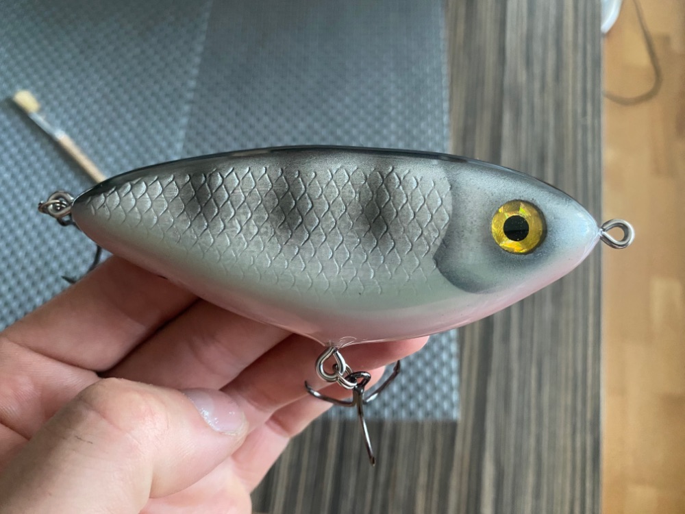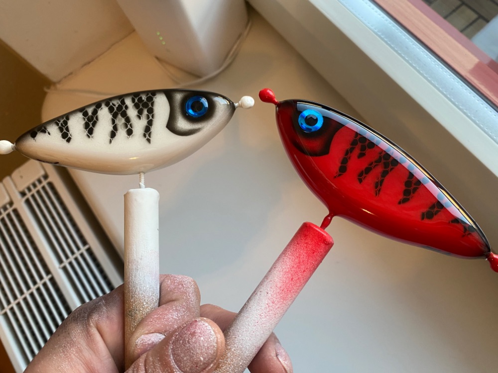 Всем привет! Вот хочу поделиться первыми своими джерками, только после лака. Практика с аэрографом так же отсутствует, приобрел буквально пару недель назад. Формы рисовал от руки, материал пвх, размер 130мм без петель и вес 68 гр без тройников. Краски Тамия, лак Лв1 10 слоев. Крутилку пока не построил, сушил так в подвешенном виде.