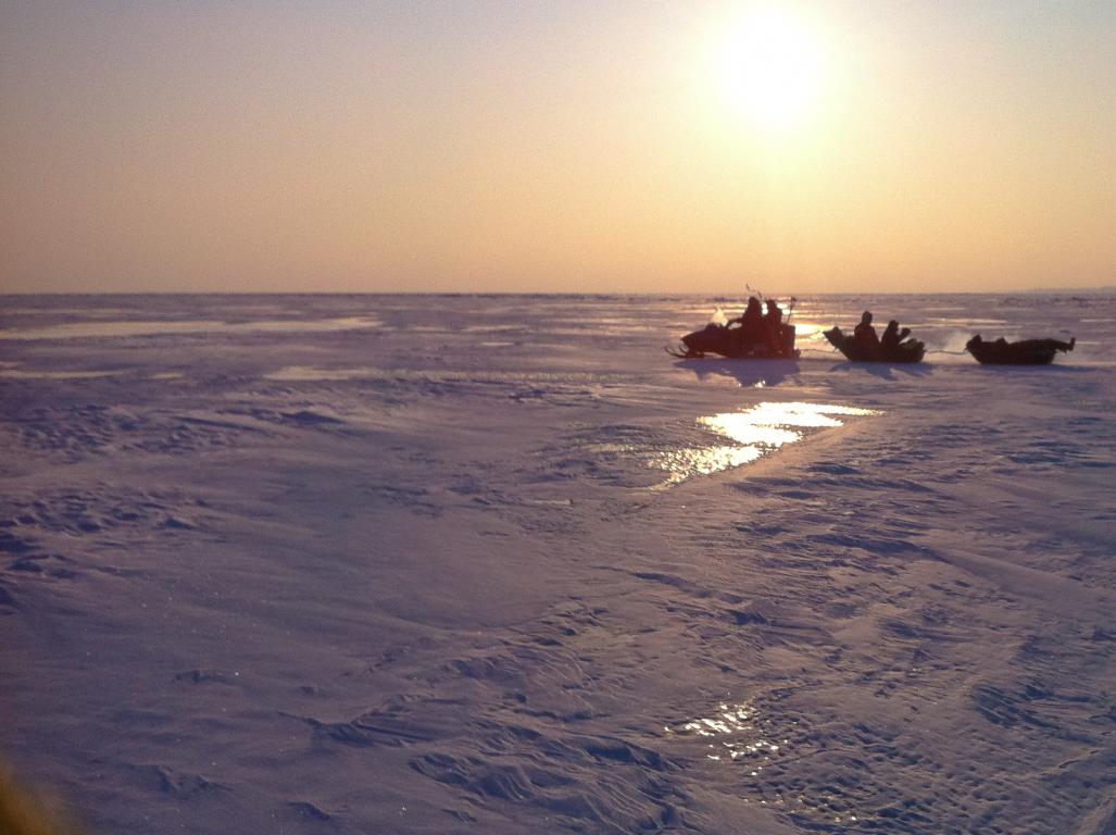Утром решаем ехать искать окуней под границу, в дальнюю даль. Прицепили к снежику двое саней и семеро полярников двинули за рыбацким счастьем. Рядом ещё двое на снежике. На 6-7 ом километре разбиваем борт саней об острейшие торосы. Решаем судьбу не проверять и тормозимся. Парни ставят палатки и начинают червячить. Я пошел вперёд, погулять, побурить, поискать полосатиков. Часиков в 11 первые поклёвки на секушку, но размер не радет... На 20 окунёв, один хороший. Поймал к 14 часам десяток съедобных и пошел в лагерь к червячников. А там, на мотыля, раздача. Плотка с окунями... и хорошие. День подходит к концу, а рыбалка тока началась. Некоторые товарищи промёрзли и с обмороженными щеками закончили рыбалку. Наши уговоры, чтоб ещё на пару часов задержаться в озере, ни к чему не привели и мы дружно поехали на базу. А там тепло и пахнет вкусно. Сварили супец из лосятины, мяско из печи достали... перекусили, а под вечер баню организовали... в снег ныряли, круто было и совсем не холодно.