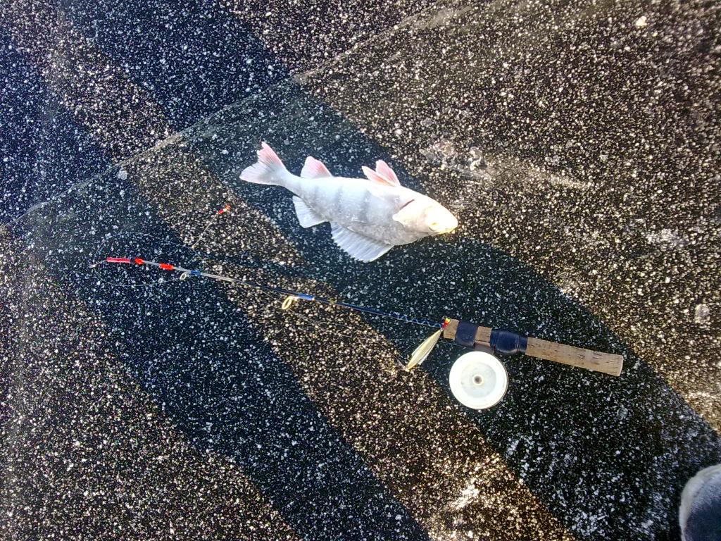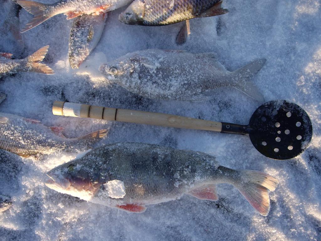 Народ разбежался и расселся, но после часа ловли в уловах не было ничего кроме мелкого окуня, начались перемещения. Попробовавшие на секушку быстро отказались от нее и ловили на мотыля.Окунь чуть крупнее еле-еле трогал мормышку. Только нано-окуни и микро-окуни бодро атаковали любую предложенную насадку. Самыми уловистыми оказались те, кто в 300 метрах от места высадки нашли точку с глубиной 3м по сравнению с 4-4.5 м вокруг. Те кто там ловил поймали по 5-7кг, остальные 2-2.5кг.