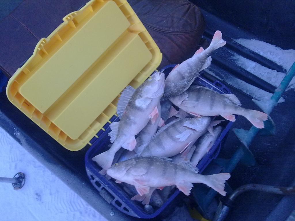 Окуня местами много, но размер... Сегодня отпустил обратно в лунку больше сотни голов точно, отсортировал пару кило в районе стограммовиков. У напарника три раза брали щучки, одну килошную удалось вытащить, поклёвок налима не было. Погуляли. размялись чуток, дальше 4-го км не пошли правда. Ловил на секушку, хорошо действовала подсадка глаза. Лёд почти до замка бура