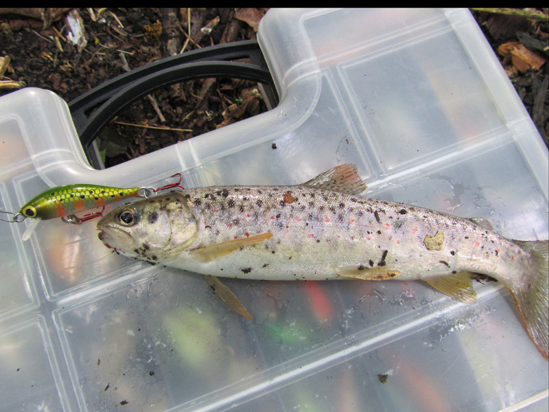 Наконец спала жара и появилось желание съездить на рыбалку, обкатать новые воблеры. Был на ручье где иногда попадается голавль, ну и форелька цепляется. Голавля видел, выходил но брать отказывался. А вот форелька зацепилась.