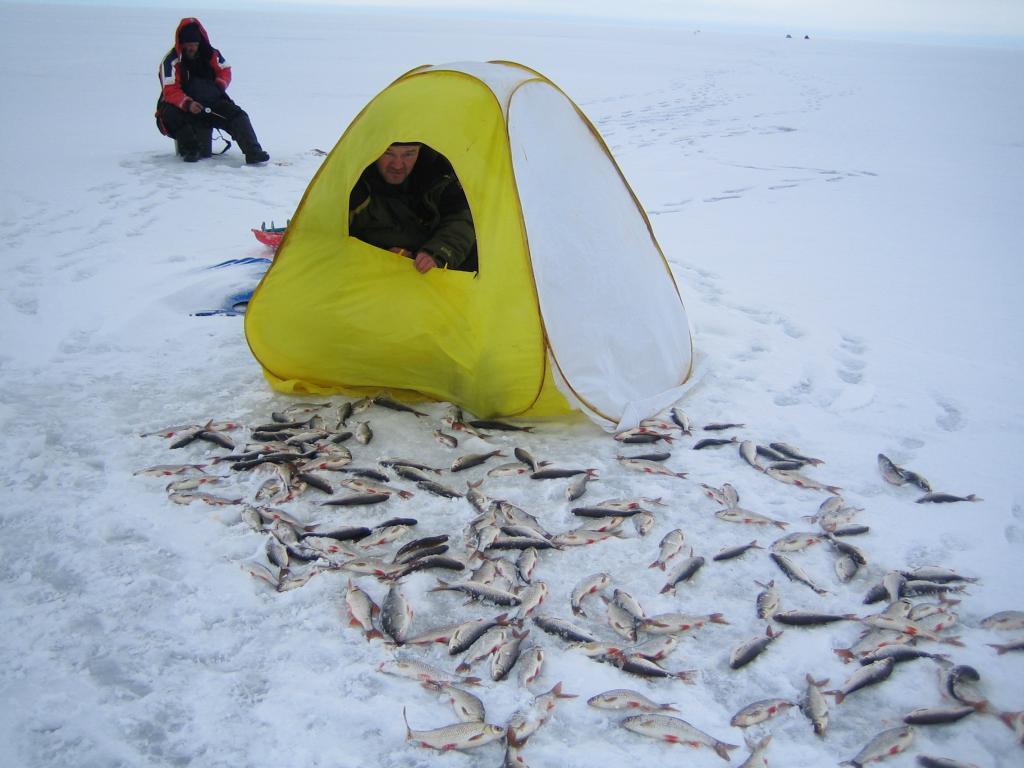 В воскресение - народу поменьше - едем на вчерашние лунки где на ночь были оставлены жерлицы. По жерлицам НОЛЬ - одну размотало и та оказаль пустой. Свои лунки чуть нашел даже с навигатором - все белым бело - снегу навалило сантиметров 5. Упирался с утра в блесну - но даже ниодного удара не ощутил. Вернулся на плотвиную лунку - забрался в палатку - ветерок уже задувал прилично. С 9 до 11 мормышка до дна не дошла - мерная ЧУДСКАЯ плотва выкидывалась в окно палатки с завидным постоянством. Подтянулись товарищи - кто то успел еще на раздачу но не все. Клев прекратился - ветер нет