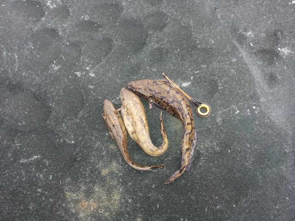 . На предыдущей рыбалке поймал налима на 1.7кг, на этот раз вытащил еще 3х и еще одного упустил, когда уже держал в руках - тот выскользнул из рук и прямо в лунку