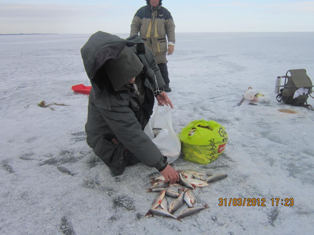 И вот оно естественное завершение зимнего сезона. Варанья и мы довольно поздно приехавшие, но отдохнувшие и выспавшиеся. И место для старта на лёд с вечера выбрали другое, без кустов лозняка и тростника. Машин почти нет становись где хочешь. Выгрузились и пошли. На сей раз всей командой отправились в район вчерашней моей ловли. Ночью прижал морозик и сегодня утром так и держиться минус шесть. Выход на лёд идеальный. Правда трещина за ночь разошлась, да и в этом месте их оказалось аж три штуки. А может ночью когда расширяло старую нарвало новых не знаю. Далье всё просто, идёшь как по асфальту. Ветра нет и солнечно. Шёл без куртки налегке, но в штанах было реально жарко. Опять всё згладилось морозом и приходилось выискивать правильный путь, но долго ли коротко ли однако мы дошли. Пробить пякой лунку уже не удавалось и приходилось вскрывать буром. Однако рассевшись по местам согласно купленным билетам мы обнаружили полнейее отсутствие рыбы. Проверив лунку волчары и ещё пару старых в этом районе и полностью убедившись в том, что рыба невзирая на вечерний закорм ушла, я отправися на поиски. Отскочив метров на сто вскрывал старые лунки дабы поменье шуметь и пробовал секушить. Кроме полосатого планктона иногда проскакивала плотва, но чувствовалось, что концентрации рыбы нет и это лишь единичные экземпляры. Один из нашей бригады всё же раскачал одну лунку и начал потягивать плотку. Я же всё продолжал поиск своей лунки метрах в ста от него. Время шло и вроде в санках рыры с красными глазами прибавлялось потихоньку, но больше двух плотвин из одной лунки выдурить на подвеску не удавалось а это говорит о её разрознености. Несколько окуней присоединились к плотве однако всё это было не тем за чем мы прили. Начал вскрывать прочти все лунки попадающиеся на моём пути, даже если они находились в пяти метрах друг от дружки. Стратегия такого поиска на мой взгляд была оправданной тем, что часто даже пять метров дают колосальный эфект разницы концентрации рыбы. И наконец мой поиск был вознаграждён и я нашол то, что искал. Подняв за короткое время на секушу пять плотвин подряд с небольшим интервалом на игру с заманухой я смотал махалку и усевшись на стульчик начал мормышить.
