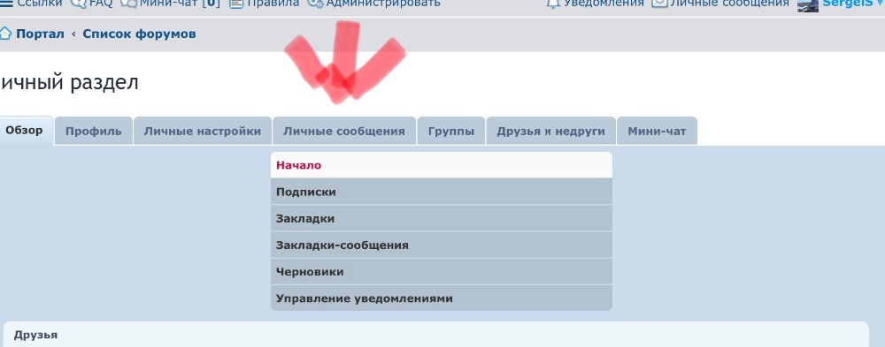 Ты хочешь сказать что зайдя в личный раздел не видишь эту закладку? А конвертик наверху виден до момента пока не кликнешь в первый разStrjem писал(а):Сергей привет. У меня в личке уже очень давно отсутствует страница Л/С. Вро де бы не заходил и уж тем более ничего не трогал. Когда после регистрации входиш на портал, на долю секунды функция в виде надписи появляется, но после полной загрузки её нет. Конвертик присутствует, но не кликабелен. Вот такая фигня....