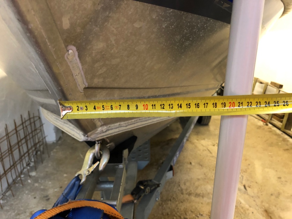 Думал, думал и решил сместить мотор ближе к килю. 27 сантиметров показалось слишком большим отступлением от линии киля. Вырезал новую площадку и сдвинул мотор вперёд. Получилось 21 см от штанги до киля. Дальше двигать не стал, так-как мотор стал выдаваться вперед за нос катера и есть опасения что он может цеплять за качельку прицепа при спуске/подъёме катера из воды. Думаю на этом и остановлюсь.