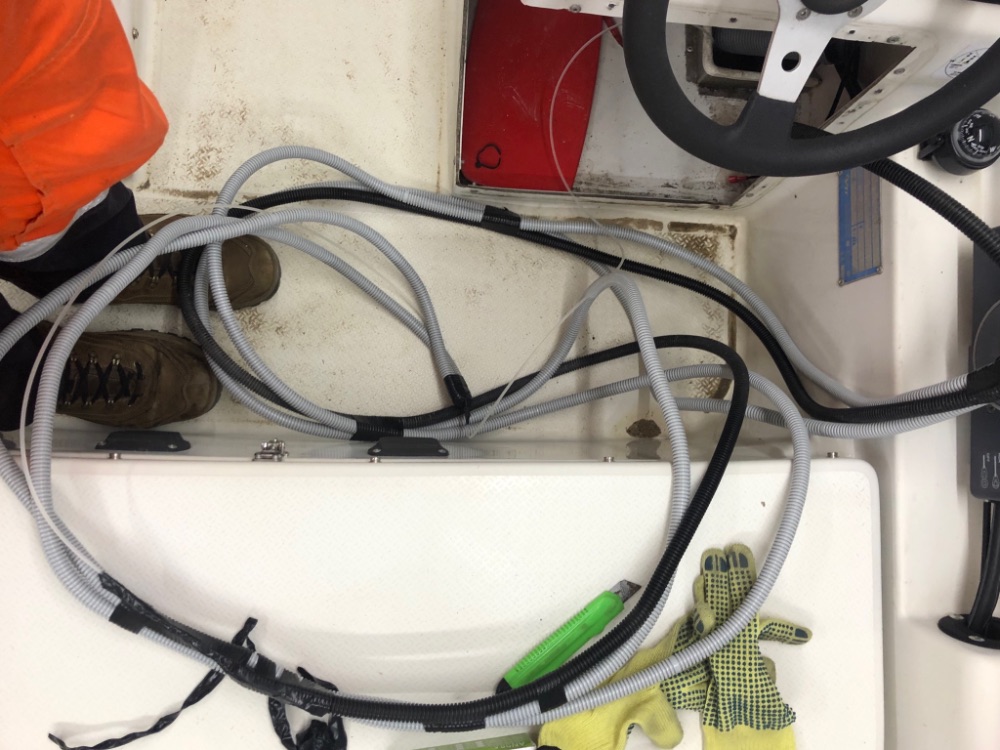 Сегодня закончил разводку кабелей. Хотел проложить запасную гофру большего диамера на нос под НМЕА провод (штекер там большого диаметра) но как ни пихал, кроме 16 гофры больше ничего не лезло