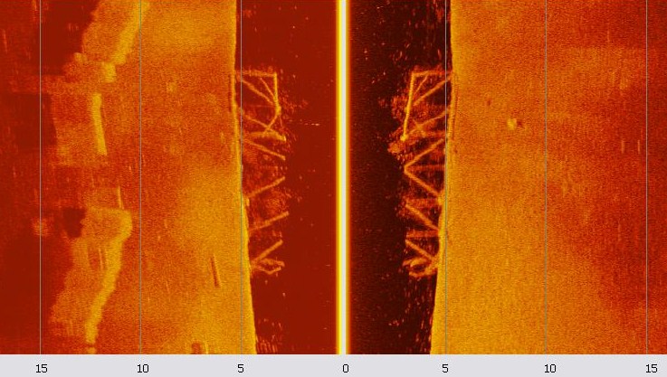 На картинках одно и тоже корыто лежащее на глубине 7м. На первой оно сосканировано в режиме торпеды с заглублением 3м на 6м кабеле, 2,5 км/час. На втором в статике с опусканием датчика до высоты 1,5м. На этой картинке два трубопровода на глубине 14м, скорость 1,7км/час, волна до 0,4м, заглубление 3м: Это экспериментальная база