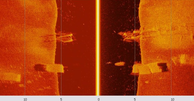 На картинках одно и тоже корыто лежащее на глубине 7м. На первой оно сосканировано в режиме торпеды с заглублением 3м на 6м кабеле, 2,5 км/час. На втором в статике с опусканием датчика до высоты 1,5м.