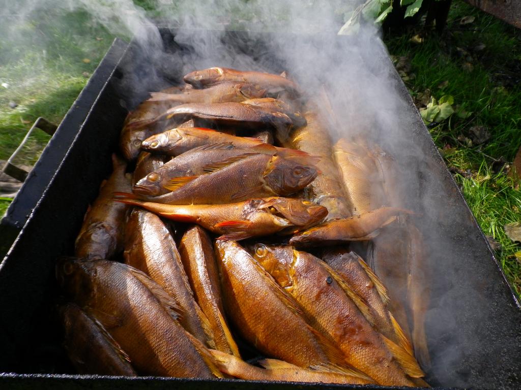 Дождик перестал, чайка присутствует. Но размерчик окушка не очень. Быренько на коптилочку наловили, да к дому и двинули.