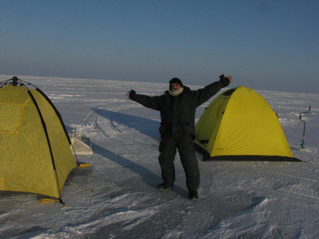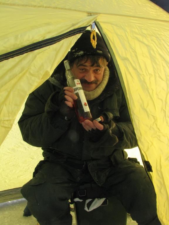 Но выдвинувшись на точку , пару раз по дороге вставал проверял в санках народ , если на пинок ногой шипели , значит ещё живые. На месте палатки собирались не на раз , но собрались , народ расселся кучно , стопки передавались друг другу, не выходя из палаток .Рыб да клЮвал , да и куда б он делся после такой штурмовой закормки .Но не в рыбе ж суть . Ближе к обеду пару рыбалеев тихонько начали поскуливать , через пол часика сильнее и не поймёшь , толи стопка до них не доходила , толи им уже много .
