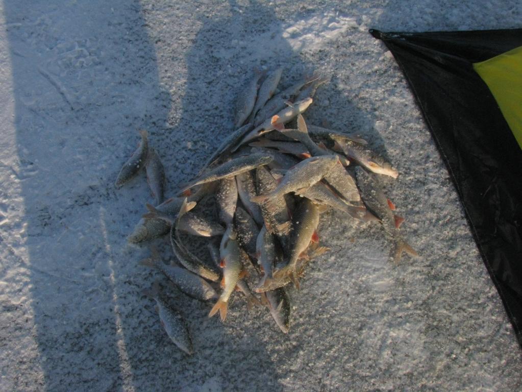 Рыбка отозвалась практически с первой проводки и клевала весь день с небольшими перерывами. Но размер окуньков точно такой же как и у берега - 1го оставляешь на льду, 2х отпускаешь обратно. Изредка проскакивала плотва. Сидеть в палатке комфортно, вылезать из нее нет никакого желания, тем более, что процесс идет достаточно активно. Наковыряли к вечеру по 5кг и вернулись на берег уже на снегоходе.