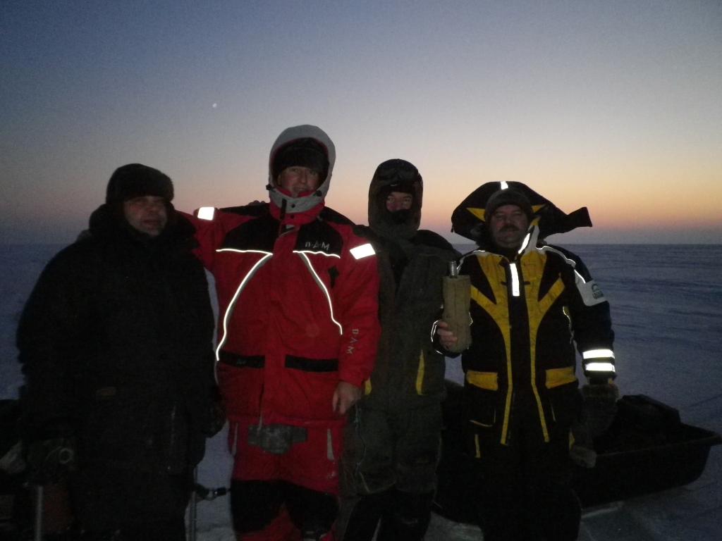 Утром погрузились в снежик и нас повезли куда то. Прибыли на произвольное место. Просто в один момент посередине ледяного поля остановились и нам сказали: пробуйте здесь!