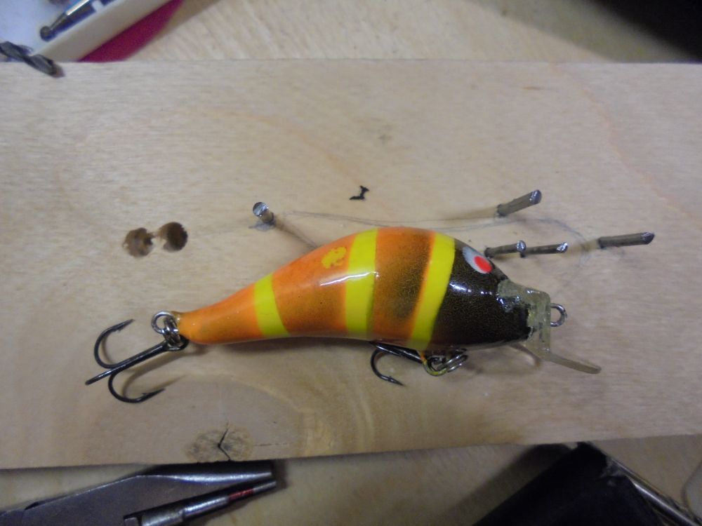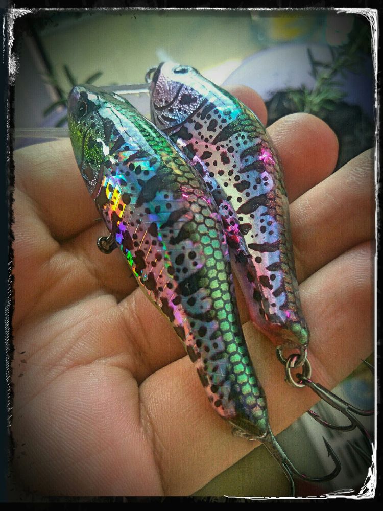 Здравствуйте! Доделал, мои первые стримовые воблерочки. Болванки были 46-47 мм, сейчас после лака «подросли» до 48 мм…. В общем, абаши - примерно 50 мм, немногим менее, тонущие. Нерж. 0,6, поликарбонат 2мм , вольфрам-й пруток 3мм (4-5мм перед центральной петелькой в головной части, и 3-4 мм сразу за ней, в хвостовой части) эпоксидные смолы. Краски – авторемонтные эмали (заморожены, слиты из баллончиков, в общем как научился на страницах этого форума), растворитель - 646. Лак эпоксидный, «ювелирка». Трафареты: по спинке, полупрозрачные пятнышки – сеточка Церезит , для проклейки швов (используют плиточники) по центру резиновая полоса, но она легко удаляется. Пятнышки под «форельку» – с прозрачными пленками, папками угловыми у меня не очень пока получилось, качество трафарета не нравилось, и я пошел другим путем)). Нашел тонкий алюминий, почти фольгу, отрезал две пластинки, прокатал сантиметровым шаром от подшипника профиль воблера, чтоб трафарет плотно прилегал к телу, просверлил гравером отверстия, надфилями придал законченный вид. Половинки приложил к телу, закрепил маленькими зажимами со стороны хвостика и носика – попробовал «брызнуть» аэрографом – вполне… На трафареты потратил вечер. Зашел на страничку Володи Стеклодува (Выставки работ), посмотрел на балансирчики, как покрашены детали, жаберные крышки – блин, все вроде бы просто, а попробуй сделай… Зимними вечерами, первый опыт. (Выйдет солнце, сфотографирую окончательный вариант, а пока у нас метель, «ноябрь»…)