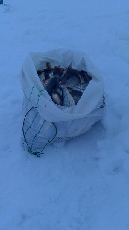 Пробежался каких пол-километара в озеро на чистый лед и новая лунка почти сразу откликнулась хорошенькой плоткой. После нескольких рыбок, пойманных на мотыля, насадил красного червя и сразу поймал еще несколько красивых плотвин покрупнее. Дальше ловил только на червя, уменьшая размер наживки на крючке по мере истощения их запасов в банке. Моментами клев активизировался до весеннего "опустил-тащи", временами для поклевки требовалось несколько проводок. Стайка плотвы оккупировала пространство под лункой, поэтому окунята прорывались до мормышки очень редко. Когда закончились красные червячки, переключился на пиньки (белые мелкие подкрашенные) - плотва их также акцептовала, но с меньшим удовольствием. К 16 мой спецмешочек наполнился примерно наполовину и оказалось, что это ровно 12кг. Компаньоны тоже неплохо поймали от 8 до 13,6 кг. У Чеслава, чемпиона дня, еще и бонусик - лещик граммов 700 на вид (от фото отказался)