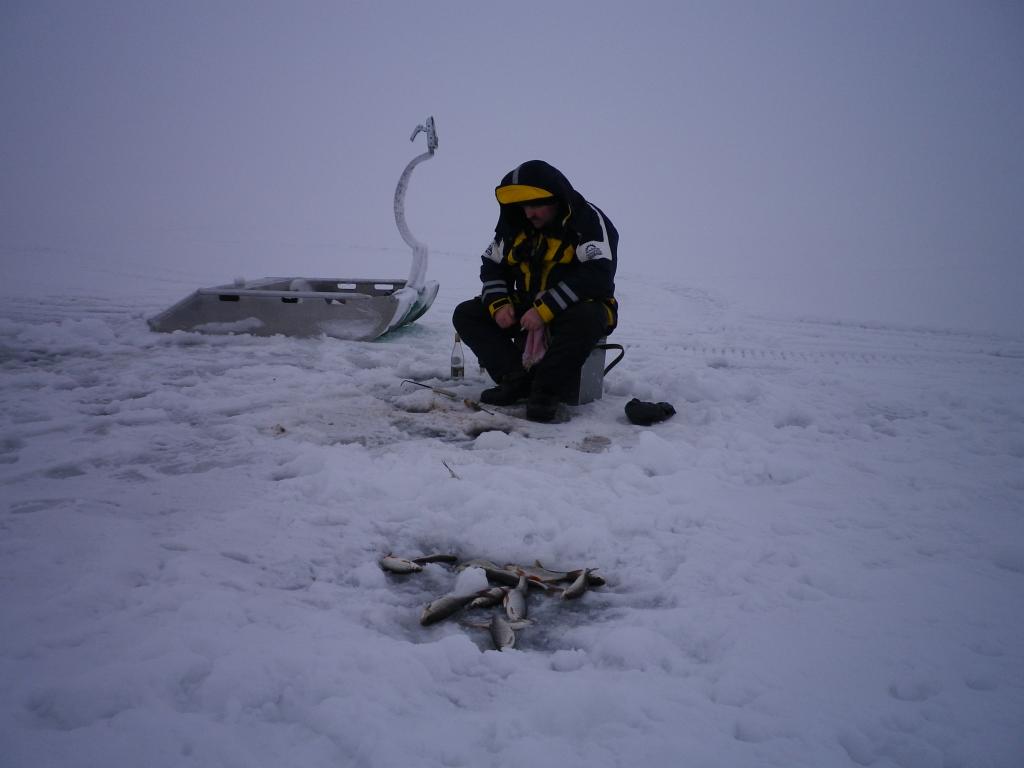 конечно зачесалось... но ведь работа... "вдруг" отпускают в отпуск...зачесалось еще сильнее.. пару звонков и в девять вечера мы уже втроем бегаем по магазу в поисках съестного и жидкого... после полуночи уже на берегу... немного чАю за отпуск и хороший клев... пару часов удалось всеж покемарить... с рассветом включаем жопс и вперед в озеро... погода сказка... ветра ноль и температура тоже ноль...ехать конечно не ахти но сностно... и вот она заветная точка... ничего делать не надо... просто выходишь из машины достаешь удочку и мокаешь в уже закормленную луночку... рыбка отозвалась сразу... ловить приятно... не просто опустил достал... иногда надо и потрясти и еще чего там мы обычно делаем... хотя бывало, что и включали мега клев, когда клевало даже на пустую мормышку... так делая перерывы на перекусить и покурить наковыряли мы плотки каждый больше 25 килов... вот такие довольные поехали домой... кто допивал чАй а я думал когда опять на лед...