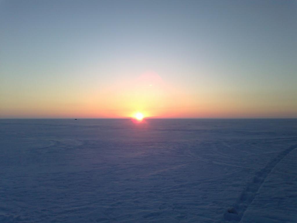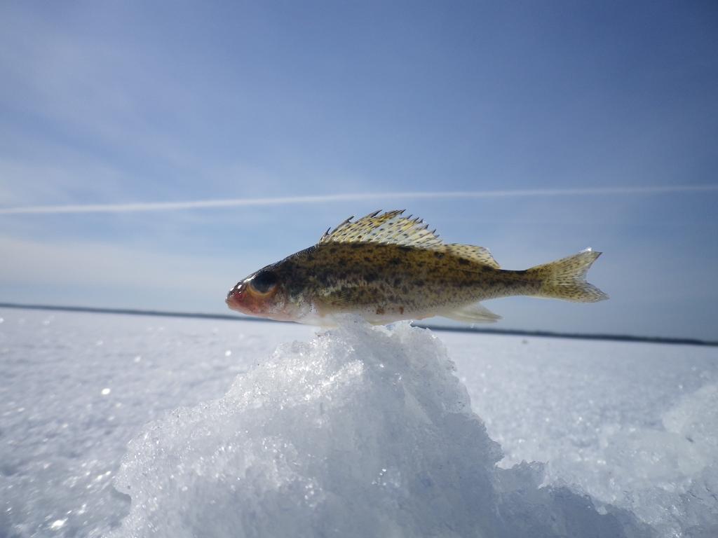 Красивая плотва вперемежку с небольшим окуньком поклёвывала очень лениво. В итоге к 5ти часам у меня 6, у друга 8 и у супруги 9 (8е марта всё таки). Двинулись выезжать с озера без навигатора. В результате 30 км по озеру и выехали в Кольке. Надо признать, что езда по озеру приятная, солнце светит, скорость в районе 60 км (Land Cruiser),снега на льду см 15-20, машина идёт мягко. Так что мы нисколько не переживали, что прокатились лишнего по этому океану. Никому не рекомендую на авто без полного привода съезжать с накатанной дороги далеко или повторять наши путешествия, потому что местами встречаются наносы глубиной 30-40 см в районах бывших торосов.