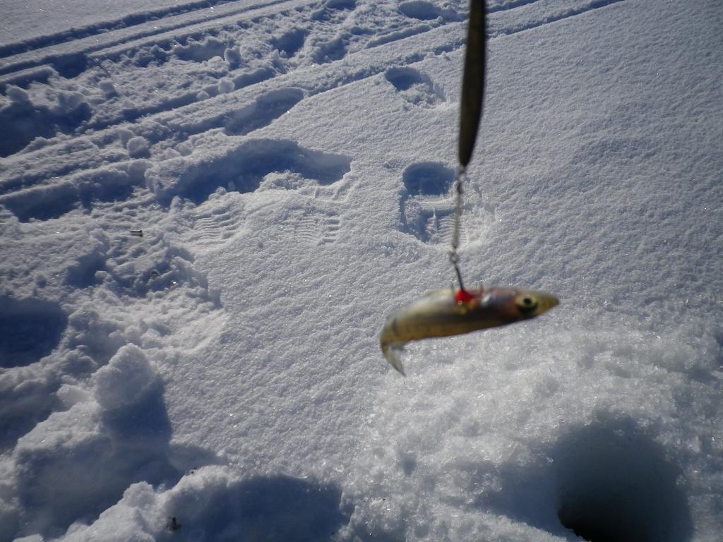 Утром рано туда же. Оставляли донки наживленные ершём с вечера. Пусто, только одна оборвана примерно метр от поверхности (шнур 1 мм толщиной). Мы подумали, что наверное о край льда обрезало каким то рыбом. Жаль. На закормленной с вечера лунке попался ёрш и окунёк, и тишина. Бурил новую и практически не кормя, очень ненавязчиво поклёвывало. Присутствие мотыля на мормышке - обязательно, иначе глухо.