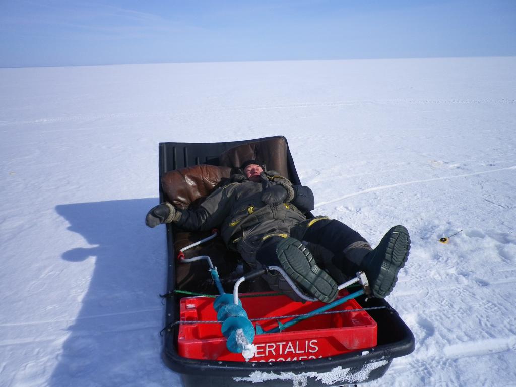 Первый день начинали ловить где то на 6м, - пусто. Потом поехали по следам, нашли место стоянки, где до этого несколько дней назад были рыбаки и судя по количеству прикормки вокруг замёрзших лунок, и оставленной таре (с Латвийской акцизной маркой), рыба тут была. Сделал быструю приборку за своими соотечественниками, поздравил жену с 8м марта, выпили с ней по рюмке и начали потихонечку располагаться. Друг был за рулём, поэтому он только закусывал