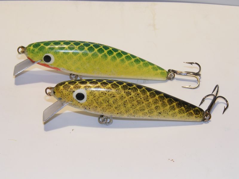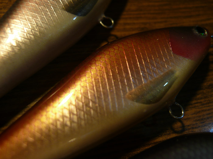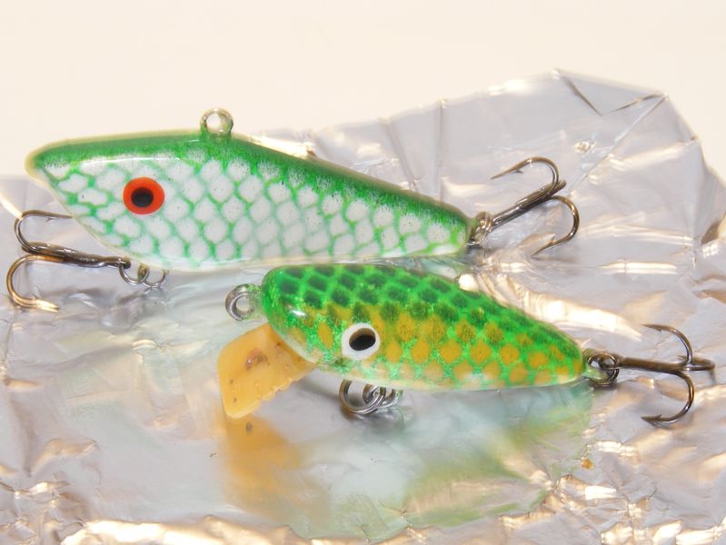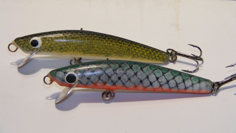 Иу меня новинки поспели. Раттлин - 76 мм (3 дюйма), акулий лягух - 50 мм, остальные 80. Все, кроме лягухи - береза. Лопасти - дюраль, у мелкого - тестолит ( кусок печатной платы). Все работает - даже жаб ( у него и вовсе очень интересная игра оказалась : морда на почти месте, за то хвостик туда-сюда - аки собачий хвост) у него небольшой крен на левый, со стороны лопасти, борт - ушло сверло от вертикали при сверловке отверстия под огрузку. Миношки оказались неожидано хороши: и управляемость хорошая, твичить легко и своя игра присутствует ( типичная для таких лопаток- пятаков). Кроме того лопатка создает приличное сопротивление при рывочках и поэтому воб сильно не проскальзывает ( в отличии от того же Дамики Пирами). Разьевшиеся минноу, они же поплющеные ( укуренные?
