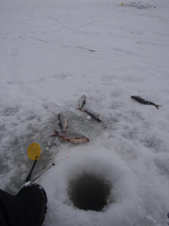 Сел прямо у берега,на плотву. Плотва не АХ какая,пришлось отбирать. Поклёвывала с 9 до 10.30,потом только матросики изредко. В 12 был дома. Лёд сантимов 20 и каша 5-10,на неделе замёрзнет и будет гууд!