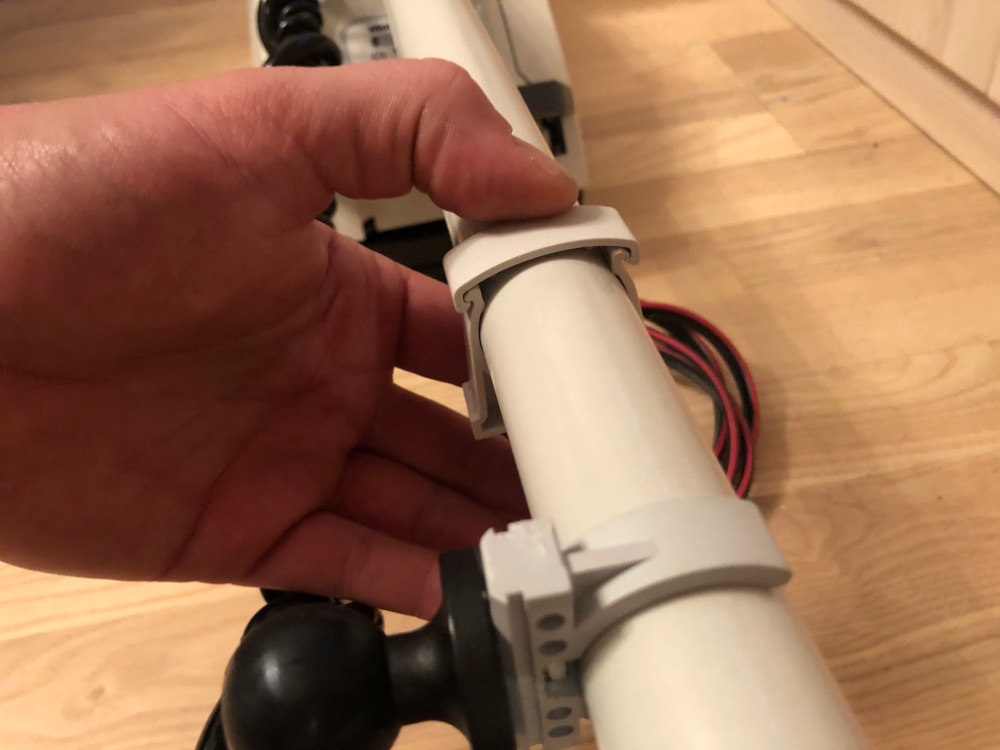 Прикинул вариант упора для штанги. Расстояние до релинга 12-14 см. Собрал стандартный быстросъёмный крепёж РАМ на шарах. Для крепления штанги попробовал применить крепёж для тоннелей электро кабелей 32-го размера. Защёлкивается идеально! Крепёж с гайкой-барашкой ставить не хочу - каждый раз при опускании мотора его придётся откручивать, нужно что-то открытого типа чтоб штанга легко в него защёлкивалась. Подобных защёлок под РАМ в продаже не нашёл, придётся что-то колхозить