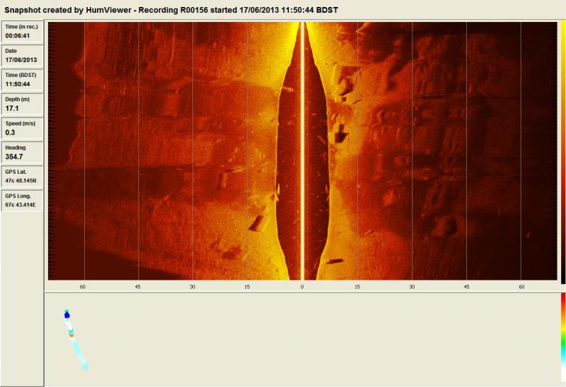 Все предыдущие скриншоты сделаны на искусственном водохранилище без всякой растительности, а вчера просканировал заросший плес: хорошо видны остатки чистого дна, ну и все бровки налицо. Для эксперементу утопил лысую покрышку от запорожца - ее видно еле еле и не с первого раза, но разглядеть можно, ну и особых иллюзий на этот счет питать не приходится. Однако для поиска перспективных мест SI то что надо