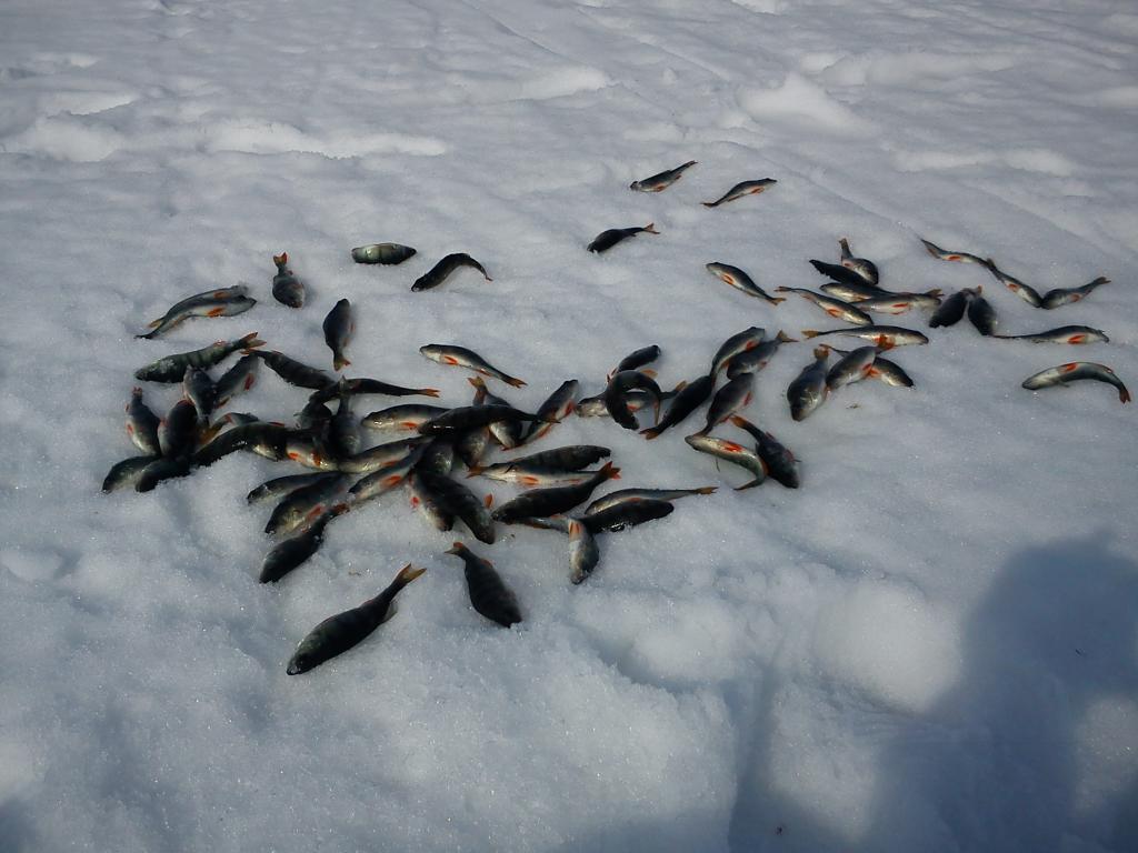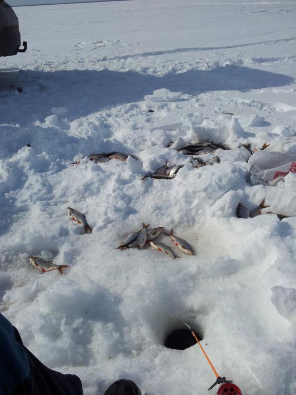 Плоточка откликнулась не совсем сразу и, в принципе, минут через 15 мыслишка была отправитья на ее поиски. Но тут загиб и первый редкий в этот день ершик мнет своим телом снежный покров чуда. Затем второй и почти сразу плоточка начала поклевывать набегами. Сначала хотела чисто опарыша, затем мотыля, затем просто на стоячку или предпочитала только игру. Поклевки были жадными, с загибом вплоть до контакта в руку. Так и просидели душевно в этом месте. По уловам, 12 кг был самый большой, дальше 10 кг. Самцы в брачном наряде. Морда лица обгорела конкретно.