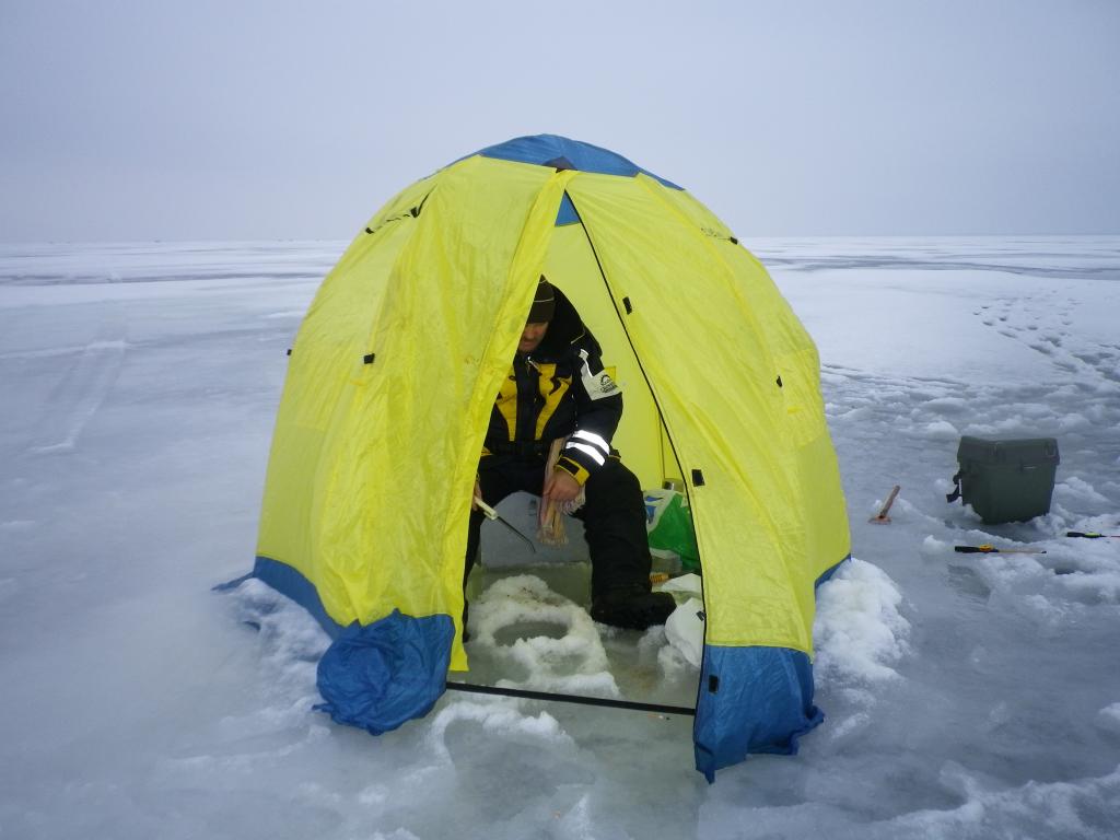Мокрый лёд, толщиной выше замка. Но, как то удалось его пробить. сверху ещё и дождик поливает. Тихо по тихому начала поклёвывать. Не так, как хотелось бы, но всё же. Решили обустроиться. Тем более, что мокрым на ветру, ну совсем не комфортно.