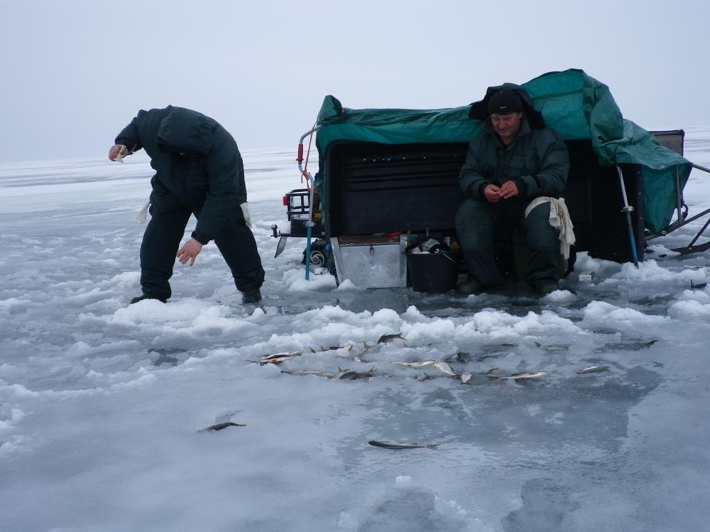 В суботу, Варанья, приткнуться не где. Но нашли всё же местечко, запарковались. Машинки, те что покрупнее, свим ходом на лёд прут. Те, что помельче сразу садятся на выезде в озеро. Мы на снежике с санками, как на пороходе. Снежик плывёт, в санках полно шуги с водой, естессно те кто в санках уже хоть выжимай. Но, добрались до точки. Вернее сказали нам, что где то тут
