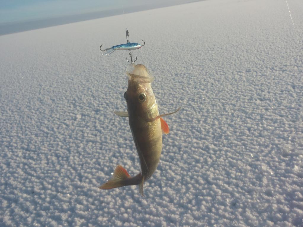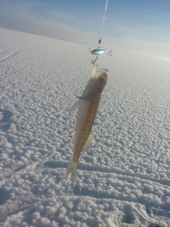 С утречька мысля , только б поклёвка не в первый заброс , ага он уже прилипает к блесенке .