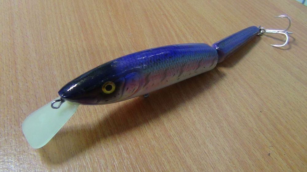 )я не силён,взял доску от овощного ящика. Твёрдая. Пропитал .Воблер из шести частей. Все пропитаны той самой смолой на горячую. Петли-скрутки.Вырезал в центральной части конструкции "карманы" (для уменьшения веса и погремушек).Хотел изначально делать с лопастью ,но попробовав в деле остановился на этом (понравилось его поведение в воде),игра и без лопасти есть .
