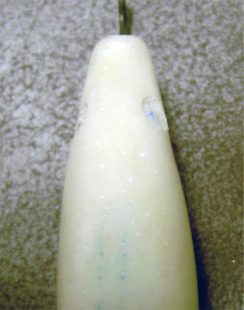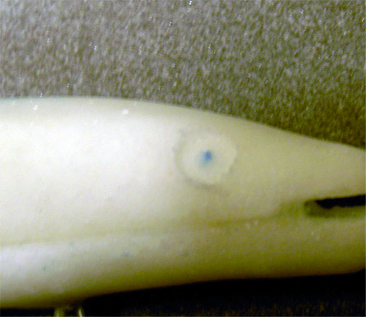 Где-то писал, но не в данном сабже... У меня тоже этот момент изначально не прошёл гладко. Насадка на самых низких оборотах "бор машинки" скакала по всей площади воблера и норовила забурить глазницу совсем не в нужном мне месте (на фотке в верху).Ikel писал(а):У меня тоже не получается вертикальной фрезой отверстия под глаза делать, уводит. Не сильно, но расположение глаз получается как у этого смайликаМне не понравилось. Пробовал на разных материалах. Даже когда шариком делаешь выемку, потом расширяешь вертикальной фрезой с выравниванием "глазного дна", то и в этом случае уводит.(...)