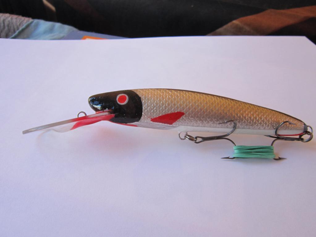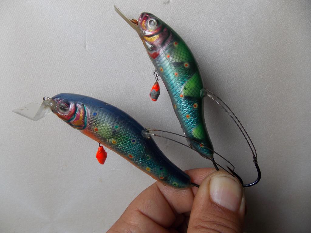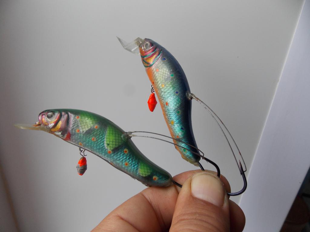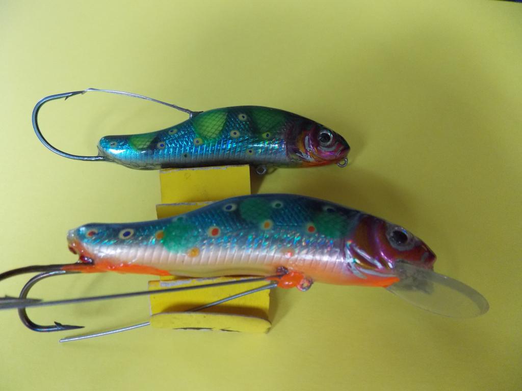 У меня оставалось 5 шт. покрашенных пластиковых заготовок воблеров но без лопостей, и я решил поэкспериментировать. Вырезал в паре штук заднюю петлю , убрал пару шариков огрузки в центр. части, оставил только в носовой /шарик -погремушка/ , и вклеил одинарный крюк и усики. Вес составил 13 гр. плавающий. с двойником -14.5 гр. сзади ещё вклеил две красненьких стразы. На всякий-сделал фотку 1. На центр. петлю планировал поставить тройник с усиками, но в спешке сборов зыбыл их купить