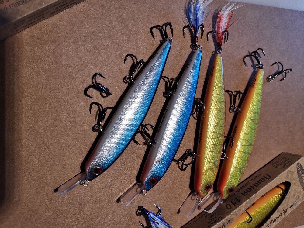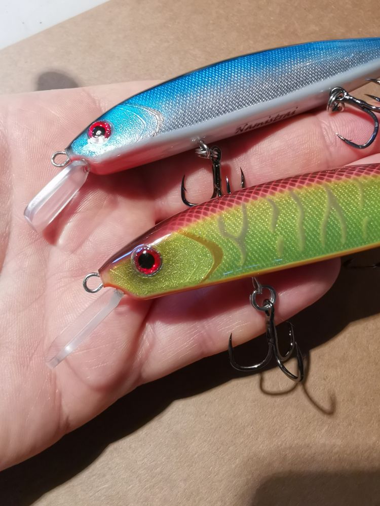 Изготовил пробную партию минноу в 110-м размере. 18-18,5 грамм, медленно всплывающие. Оборудованы шумовой камерой. На сколько занырнут пока не знаю, метра полтора предположительно... Хорошо твичатся и активно играют на равномерной проводке. Из-за размещения шумовой камеры в середине заготовки, я решил оснастить эту партию тремя крючками. Сейчас делаю вторую партию, но там обратная конструкция: одна петля в животе и две шумелки по обе стороны от неё. Интересно, что будет. Так ещё не делал.