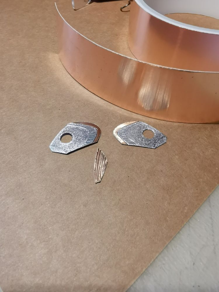 Для этой партии я решил сделать именно так: голова из нескольких слоёв скотча. Основа - медь, на верх размещаю алюминиевые детали. Плавник тоже из медного скотча.