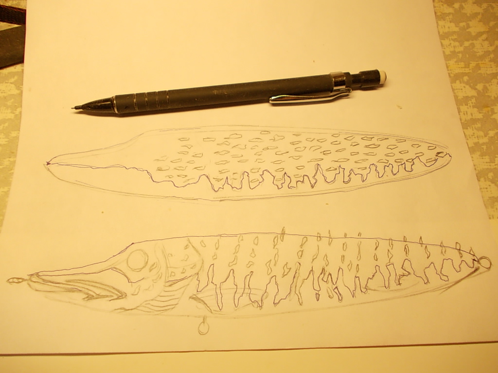 Сначало рисую щуку на бумажке ( джерка было два, нарисовал разные) смотрел на фотки своих летних щук