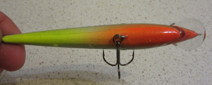 Игра у всех была похожей. Как раз вчера мой товарищ словил на подобный 3 счуки (см. зелёный в "полевых испытаниях"). Второй воблерок у другого товарища. Сегодня я откопал в своём ЗИП-е оставшийся у меня и купнул для сравнения в ванной. Как-то я совсем забыл про него, хотя верховой судачёк в своё время на него поклёвывал![]()