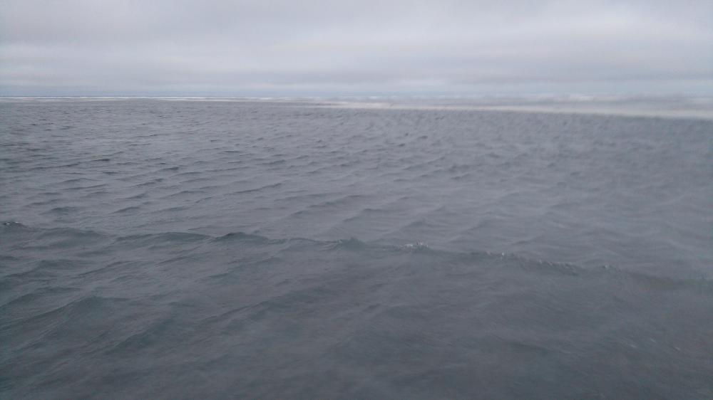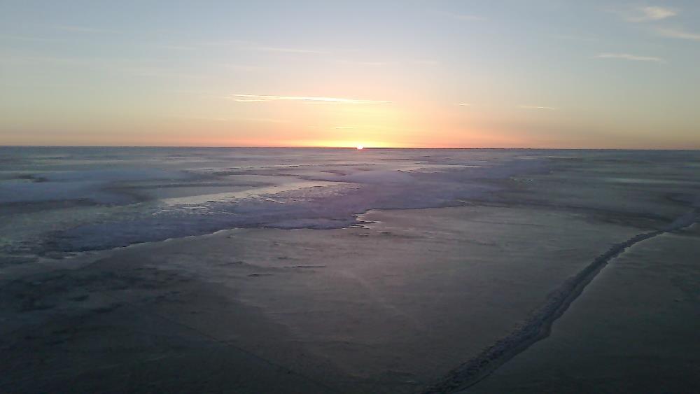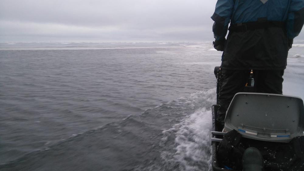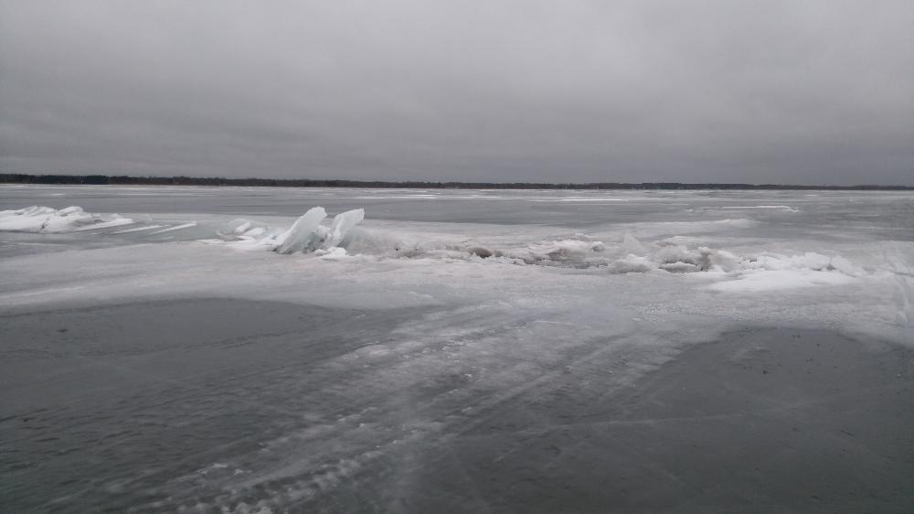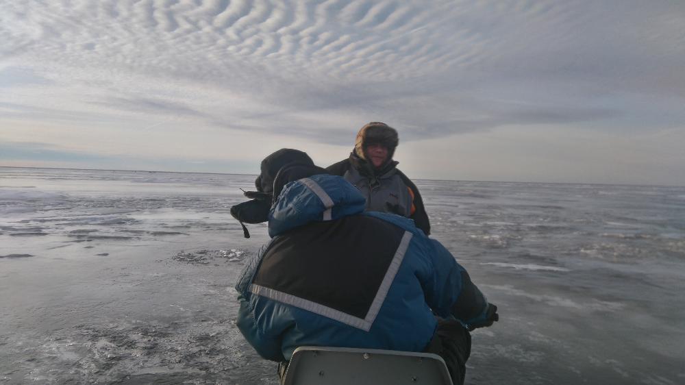 Первый выезд в пятницу. через пару километров от берега натыкаемся на трещину, довольно внушительную. Ищем проход медленно перебираемся. И уходим в далёкий поиск..