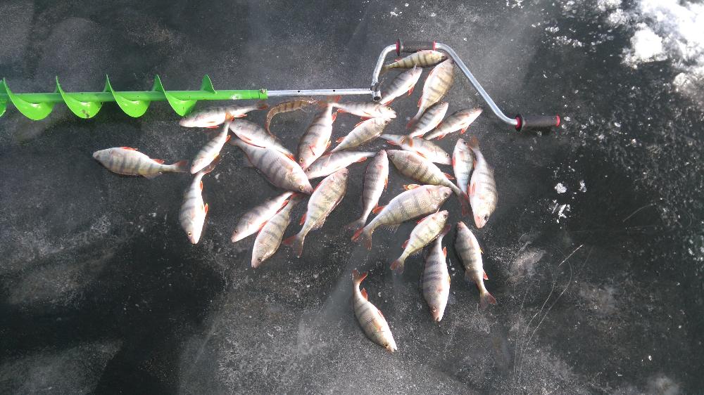 Суббота, нашёл участок где поклёвывало и он подарил 32 окуня общим весом 7,9 кг, самая раскаченная лунка дала 14 упитанных "арбузиков", клевали в основном 1-2 метра ото дна, но пара штук проскочила вполводы. Потягался с упитанной мамкой, но увы, ей повезло больше. Погода крутила, то солнечно и тихо, то лёгкий снежок и ветер.