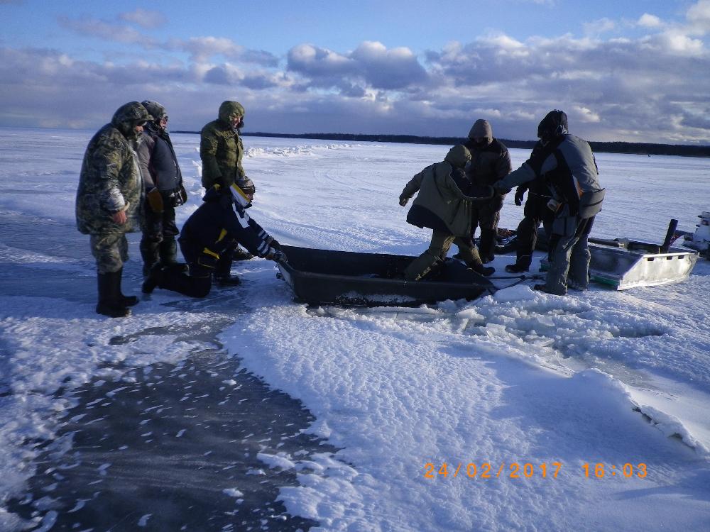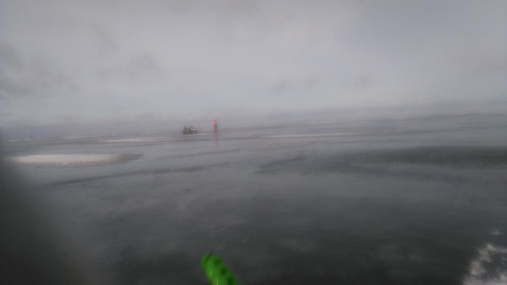 Не долгие сборы, и опять в поиск. Трещина ещё больше замаскировалась, и о её наличии можно только догадаться. Пока переправлялись, видели как пешеход в стороне влетел, но там всё благополучно закончилось. Разделились на два экипажа, и пошли на точку с двух сторон, окуня загонять. Казалось, что впереди целый день и уйма времени, но с каждой просверленной лункой этого времени оставалось всё меньше и меньше. А окунь молчит и молчит. В один момент решаем пересечься с другим экипажем.