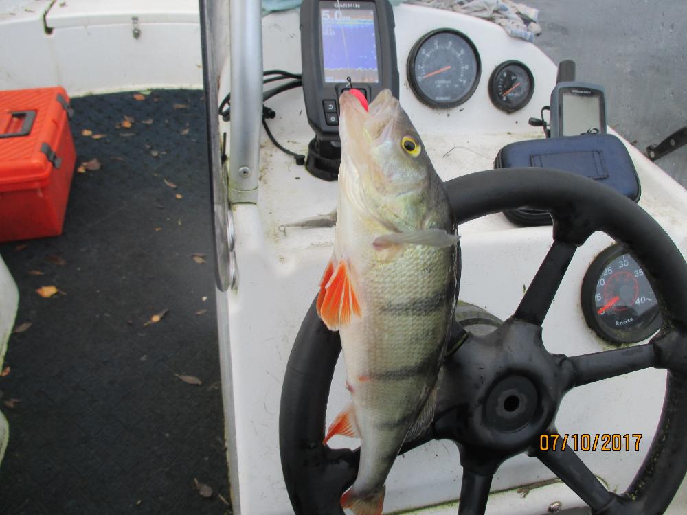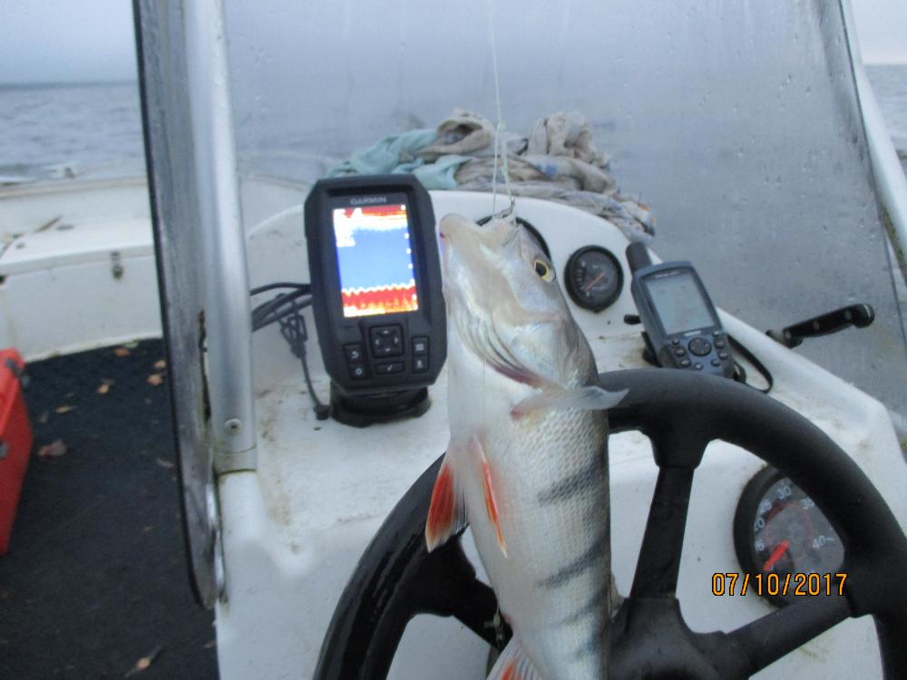 Встал на грядке , кинул якорь , тут уже пох на каком забросе клЮнет , хоть и темновато на рыб клювал , по тёмному просто мелочь 100 граммовая, некоторые и до этого не дотягивали , с восходом солнца стал и РЫБ попадатся , некоторые особи выплёвывали снетка , так его подсадка на крючёк , даже не давала снасточке до дна дойти как окунь бил .Вообщем то наверно ни одной пустой проводки и не было , то на дальнем забросе рыб , то прямо под лодкой . Ловить пришлось стоя, лодку качает не по детски , а сам как гирокомпас , когда ветер уже по ушам стал дуть сильней , думаю уже и хватит , на коптилку то уже было .